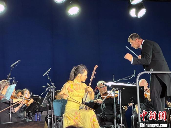 當地時間27日晚,《千里瀟湘·絲路回響》交響音樂會在俄羅斯首都莫斯科克里姆林宮劇院舉行。圖為二胡演奏家張音悅演奏《長城主題隨想曲》。中新網記者 田冰 攝