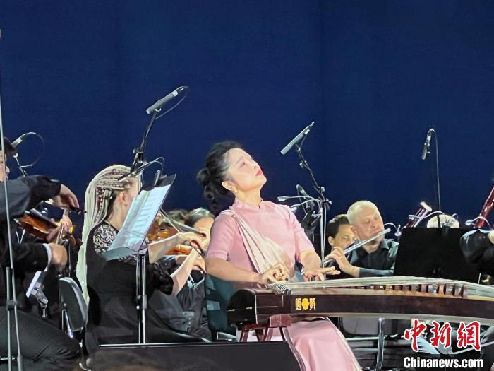 當地時間27日晚,《千里瀟湘·絲路回響》交響音樂會在俄羅斯首都莫斯科克里姆林宮劇院舉行。圖為青年古箏演奏家陳卉與樂隊合作的《云裳訴》。中新網記者 田冰 攝