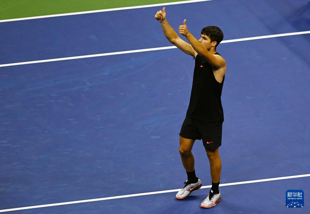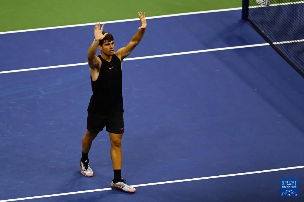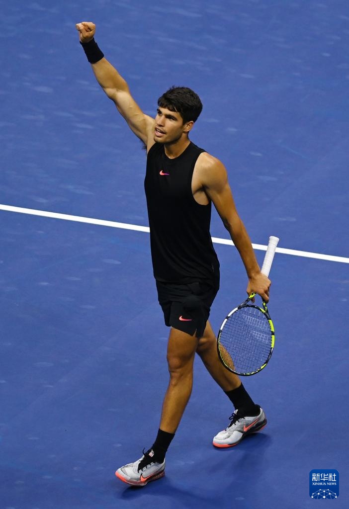 8月27日,阿爾卡拉斯在比賽后慶祝勝利。新華社記者 李睿 攝