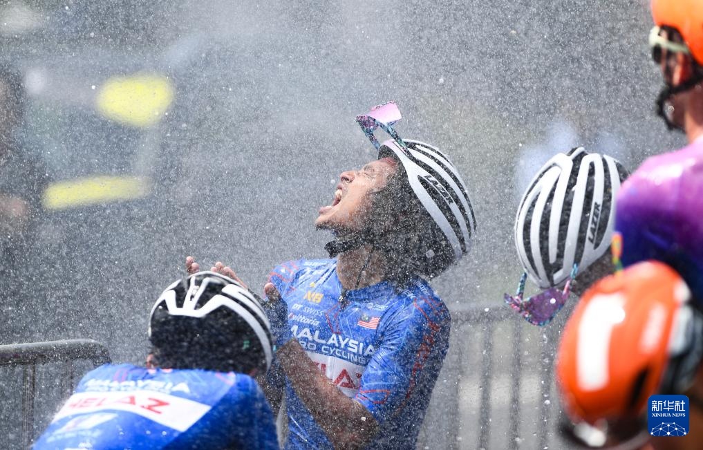 8月28日,參賽車手在比賽結束后利用水霧降溫。