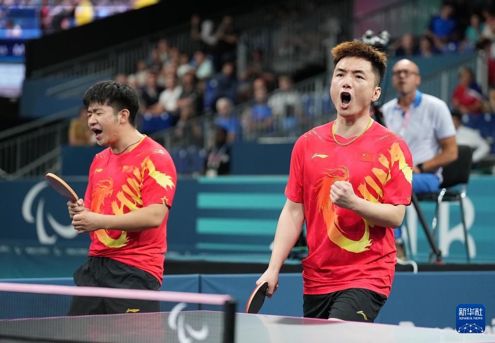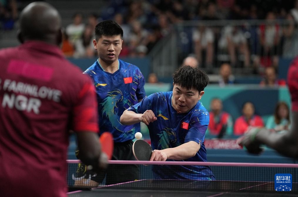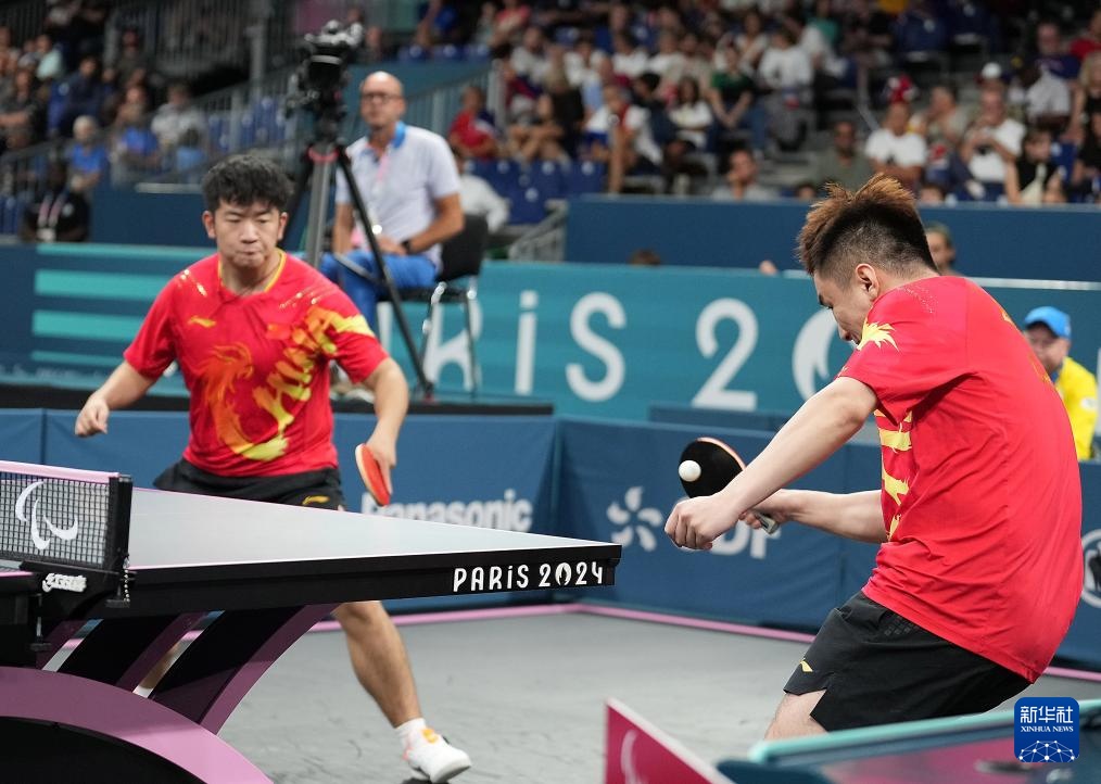 8月29日,中國組合黃家鑫(右)/彭偉楠在男雙14級16強(qiáng)比賽中。他們3比0戰(zhàn)勝尼日利亞組合阿拉比/維克托。