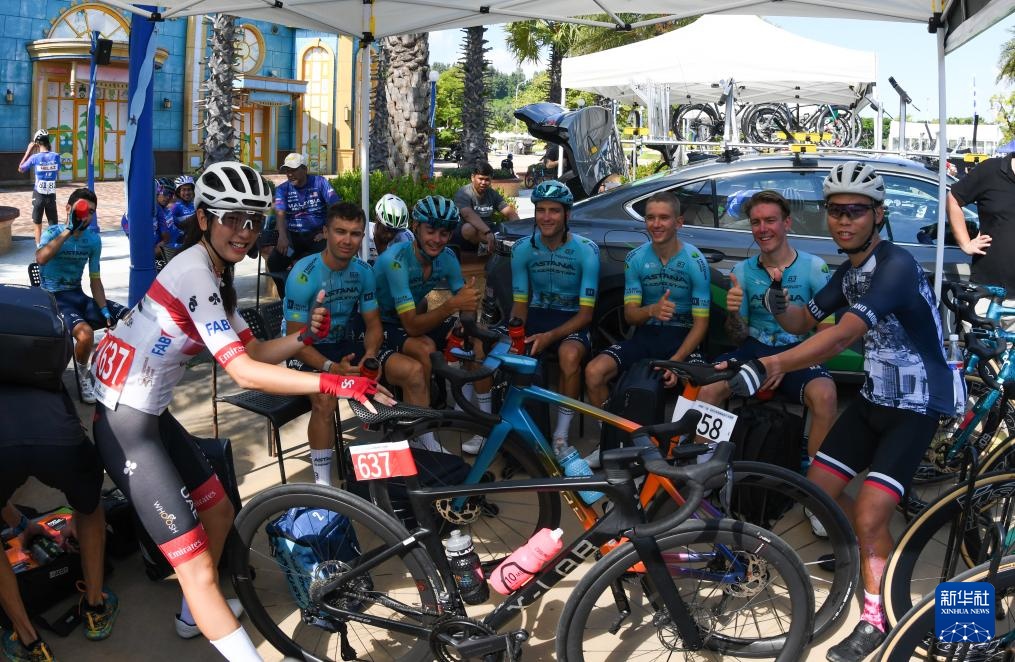 8月29日,自行車愛(ài)好者同哈薩克斯坦阿斯塔納車隊(duì)車手合影留念。