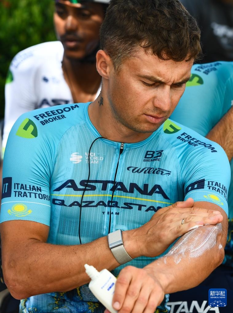 8月29日,哈薩克斯坦阿斯塔納車隊(duì)車手盧岑科進(jìn)行賽前準(zhǔn)備。