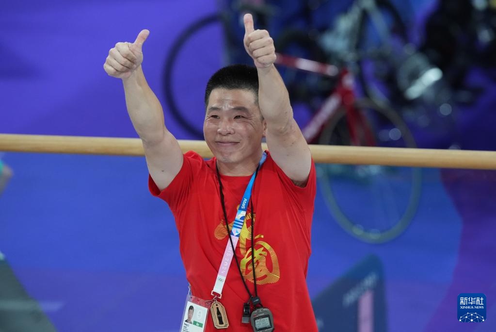 8月29日,場地自行車教練員李鵬慶祝王小梅奪冠。