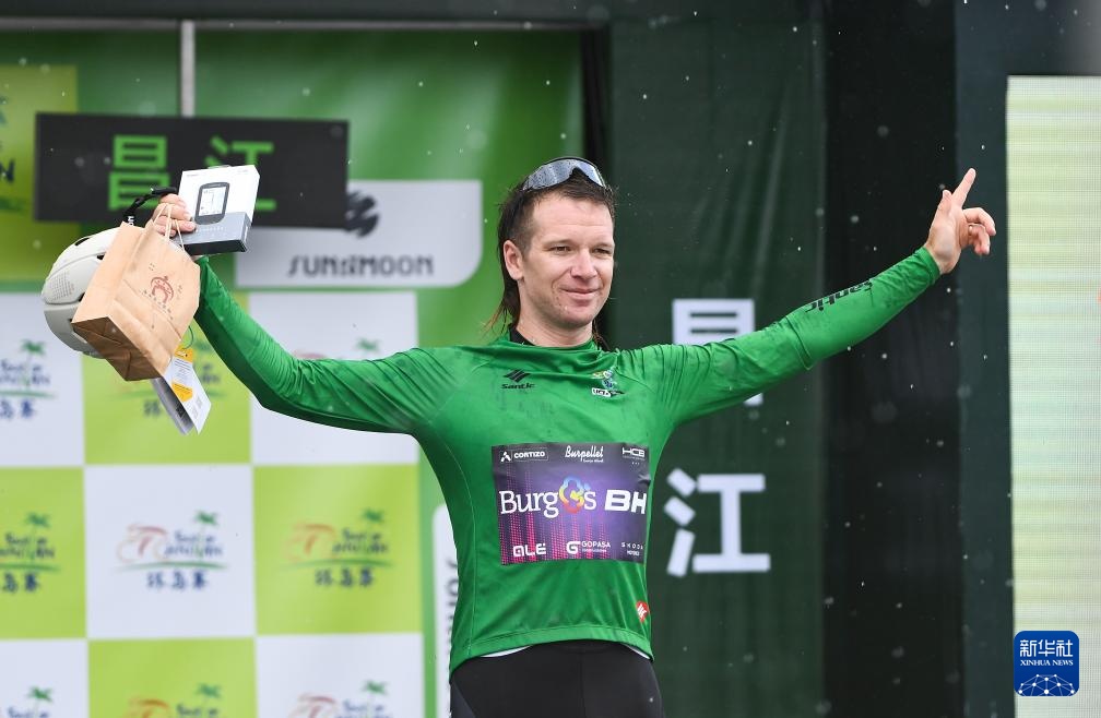 8月30日,西班牙布爾戈斯-BH車隊車手蓋特獲得代表沖刺總積分第一名的綠衫。新華社記者 楊冠宇 攝