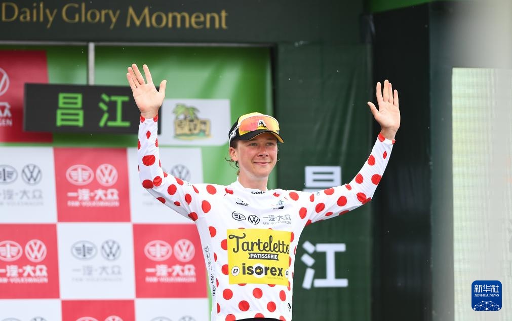 8月30日,比利時塔特雷托-艾索雷斯車隊車手亞歷克斯·范登布爾克獲得代表爬坡總積分第一名的圓點衫。新華社記者 楊冠宇 攝