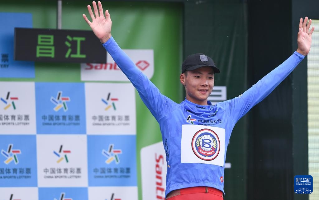 8月30日,巴迪瑞洲際車隊車手王奎程獲得代表亞洲最佳個人成績的藍衫。新華社記者 楊冠宇 攝