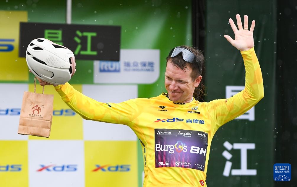 8月30日,西班牙布爾戈斯-BH車隊車手蓋特獲得代表個人總成績第一名的黃衫。新華社記者 楊冠宇 攝