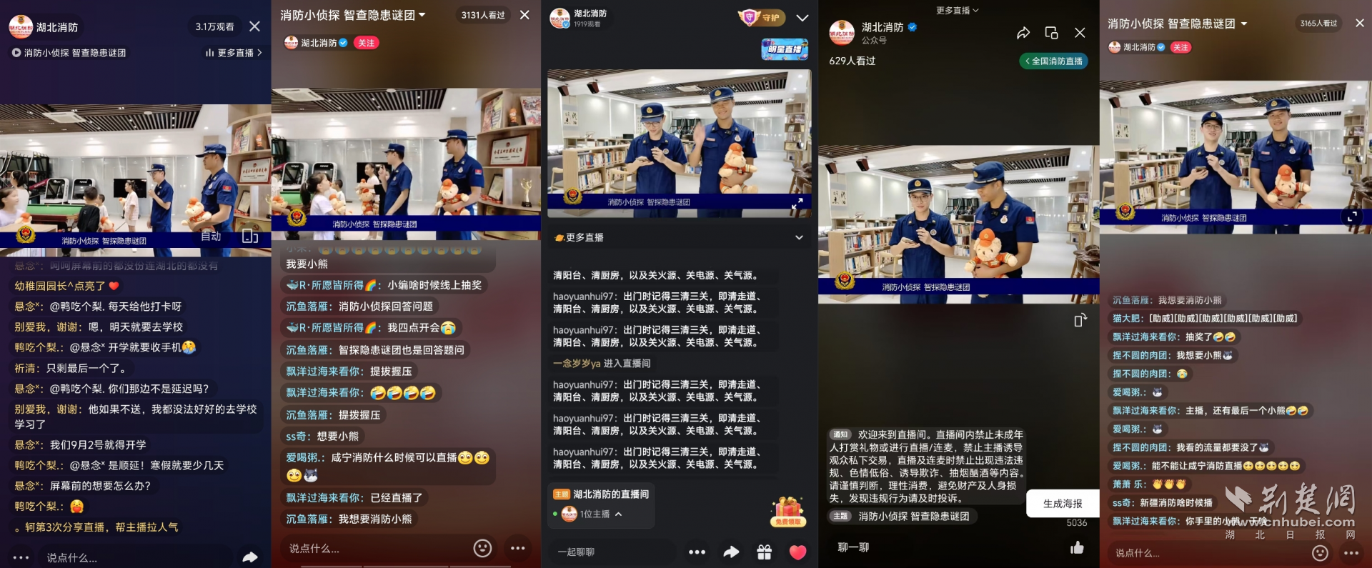 “各位網(wǎng)友大家下午好,歡迎來(lái)到湖北消防的直播間,今天,我們的直播既有“藍(lán)朋友”分享消防安全知識(shí),還邀請(qǐng)了許多萌娃化身“消防偵探”查謎團(tuán)、除隱患,更有互動(dòng)環(huán)節(jié)送出精美禮品“消防小熊”!直播開(kāi)始后,消防宣傳員將直播內(nèi)容進(jìn)行了簡(jiǎn)單介紹,瞬間將氣氛拉到了高潮,大量的網(wǎng)友涌入直播間刷屏、留言。“開(kāi)學(xué)了,學(xué)生宿舍用電有哪些注意事項(xiàng)?”“發(fā)生火災(zāi)后如何安全逃生?”對(duì)于網(wǎng)友們有關(guān)校園、家庭消防安全的提問(wèn),消防宣傳員進(jìn)行了詳細(xì)解答,不僅通俗易懂的科普了消防安全知識(shí),更贏得了網(wǎng)友們的紛紛點(diǎn)贊。
