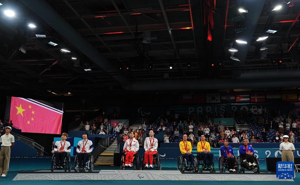 8月30日,冠軍中國(guó)組合劉靜(左四)/薛娟(左三)在頒獎(jiǎng)儀式上唱國(guó)歌。新華社記者 侯昭康 攝