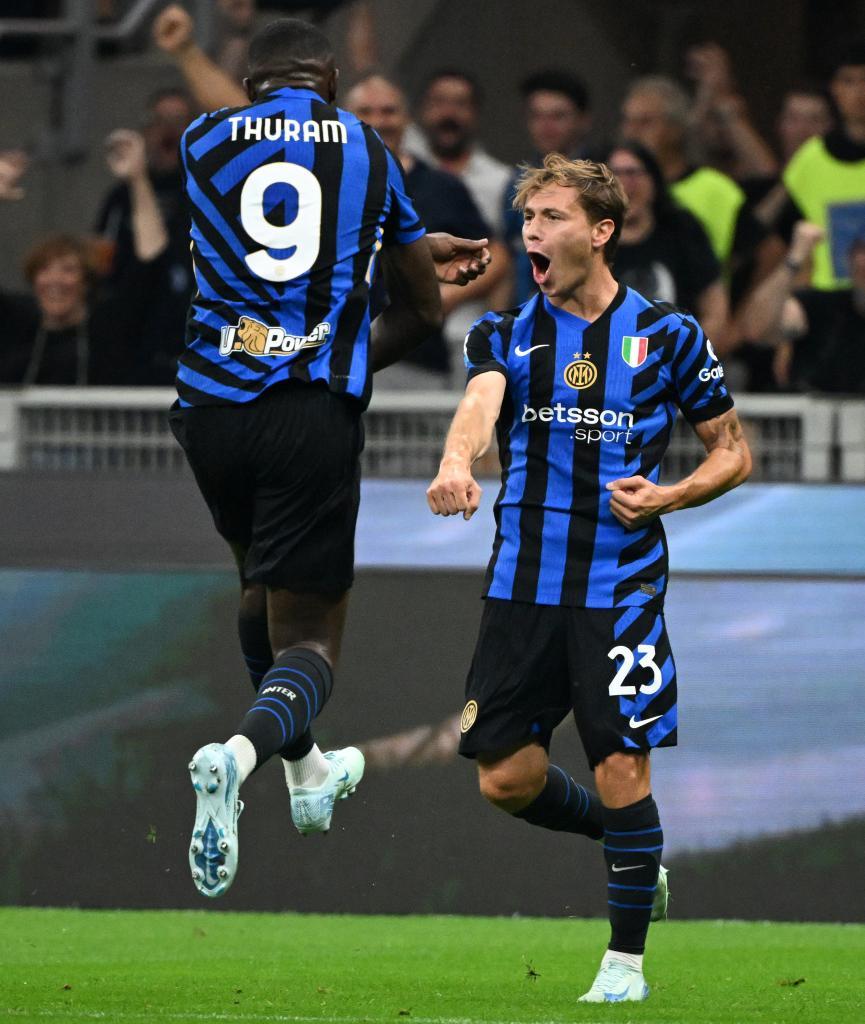 8月30日,國際米蘭隊球員巴雷拉(右)與隊友圖拉姆慶祝進球。新華社發(阿爾貝托·林格利亞攝)