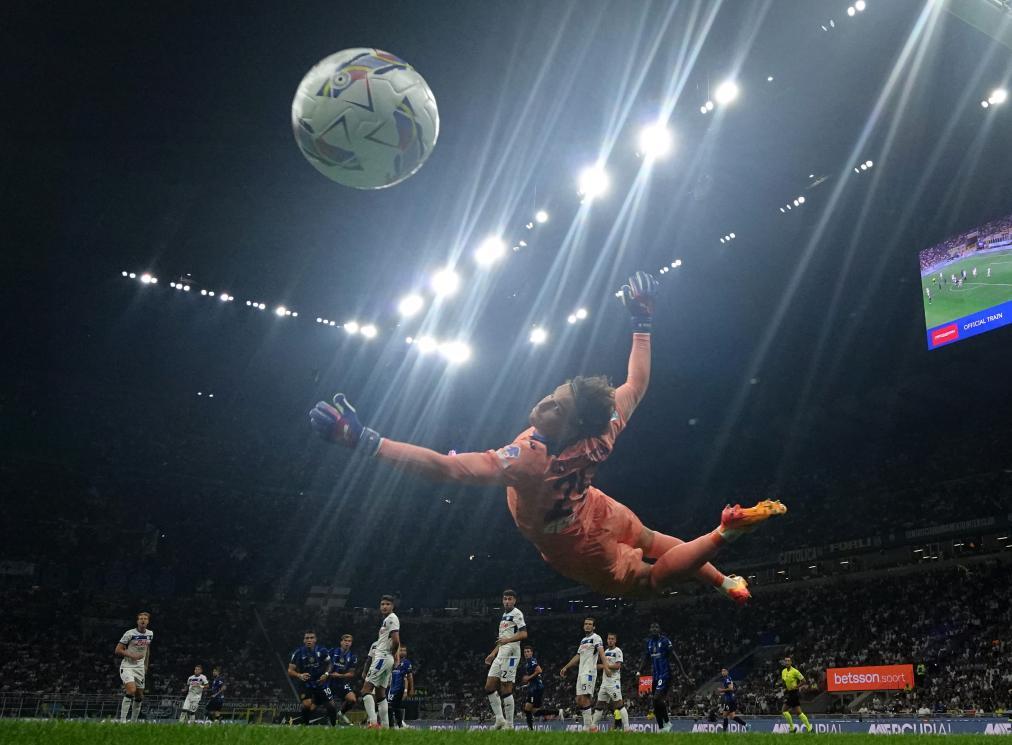 8月30日,亞特蘭大隊守門員卡爾內塞基(前)未能撲出國際米蘭隊球員巴雷拉的射門。新華社發(阿爾貝托·林格利亞攝)