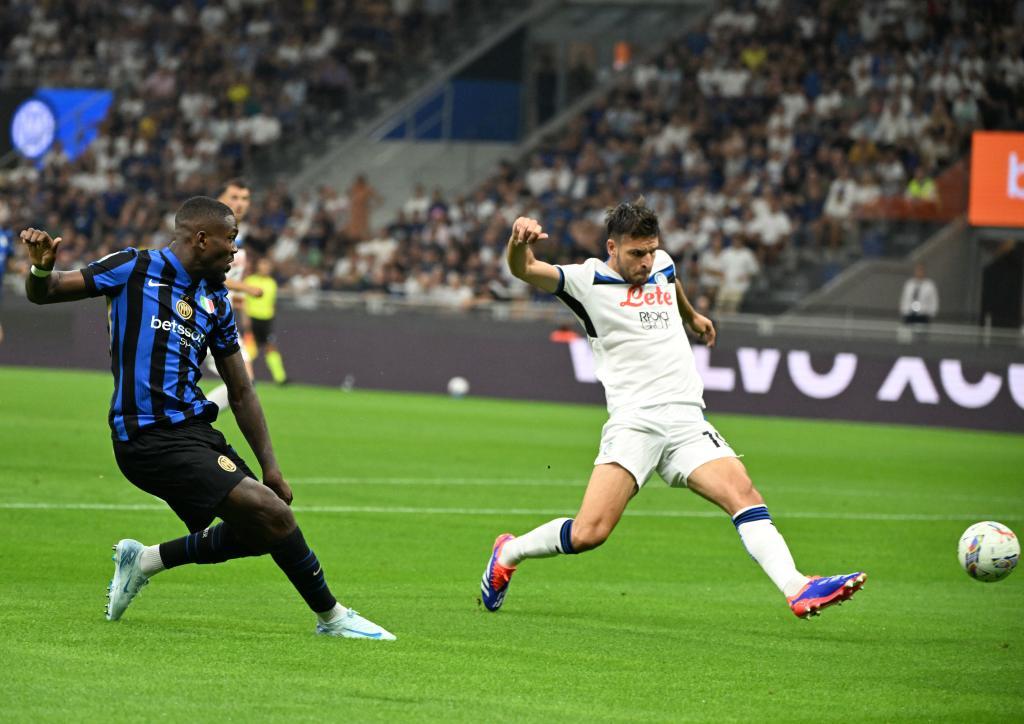 8月30日,國際米蘭隊球員圖拉姆(左)與亞特蘭大隊球員吉姆西蒂在比賽中拼搶。新華社發(阿爾貝托·林格利亞攝)