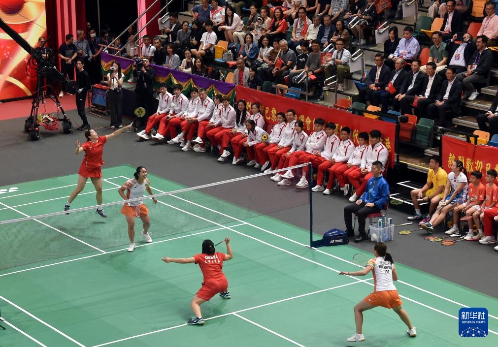 8月31日,羽毛球選手賈一凡(左一)/陳清晨(右二)與中國香港選手進行羽毛球表演賽。新華社記者 盧炳輝 攝