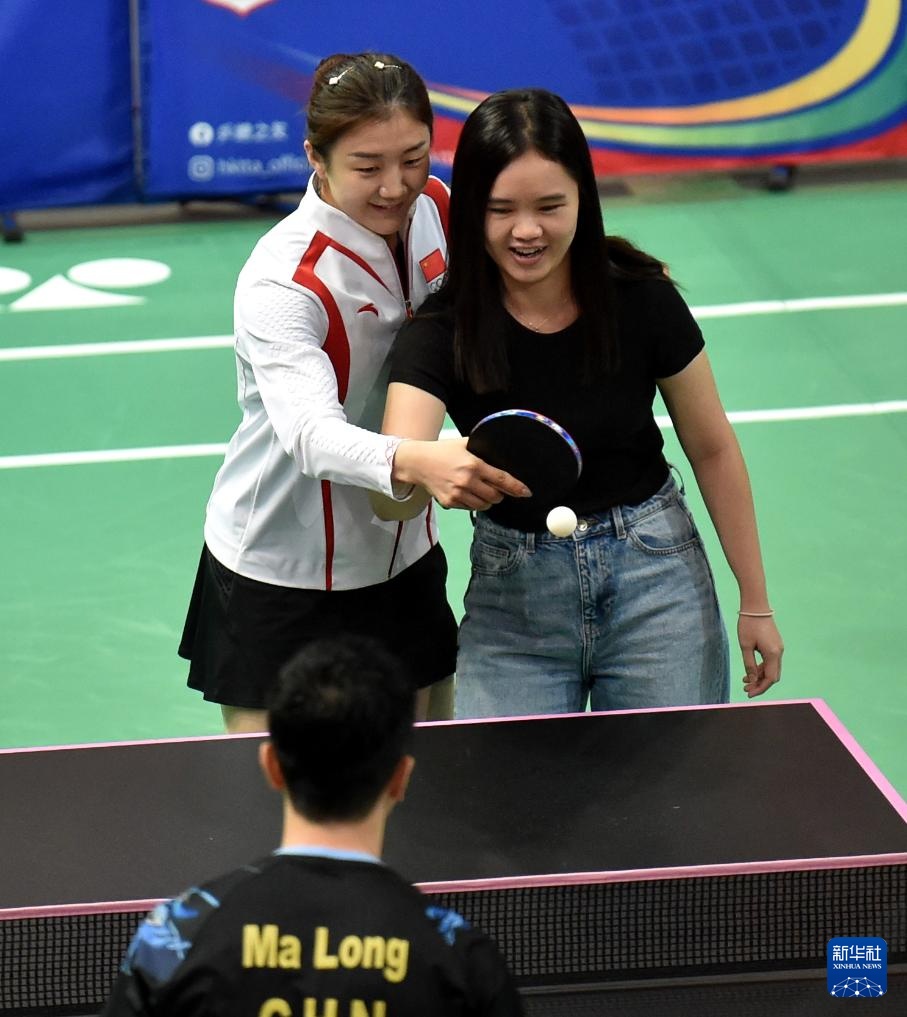 8月31日,乒乓球選手員陳夢(左)指導一位觀眾打球。新華社記者 盧炳輝 攝