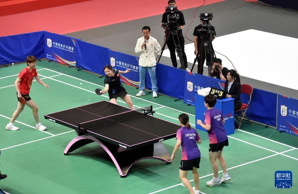 8月31日,乒乓球選手陳夢(左二)、王曼昱(左一)與中國香港乒乓球選手杜凱琹(下右)、李皓晴進行表演。新華社記者 盧炳輝 攝