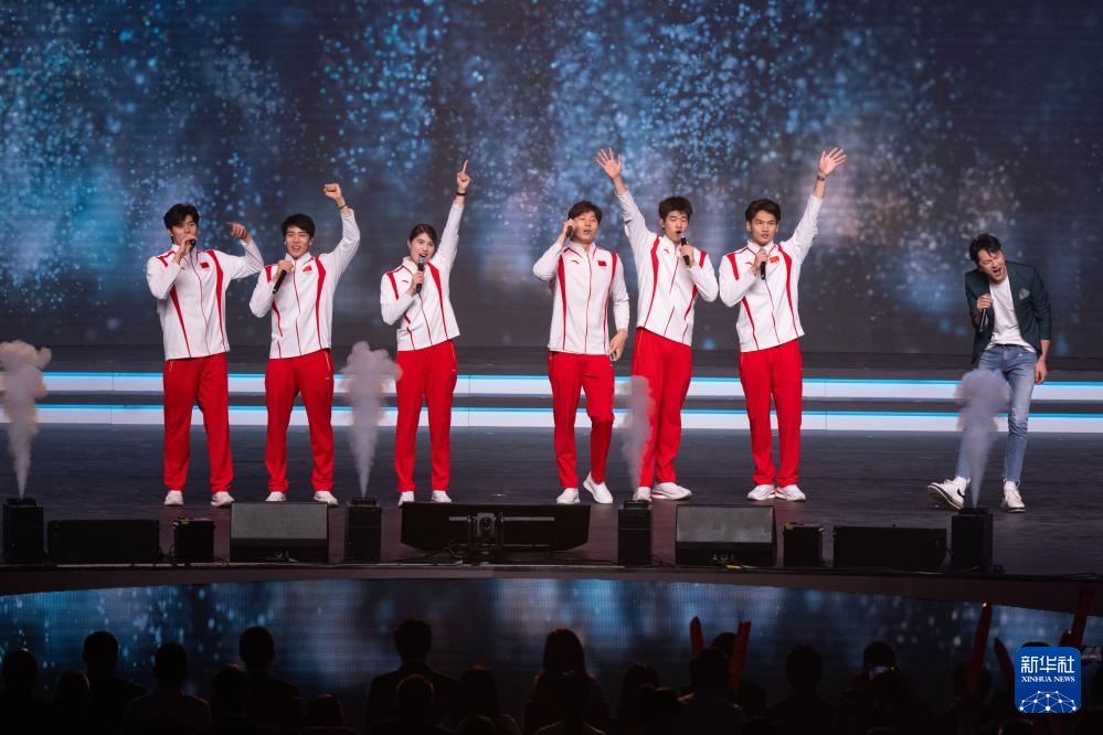 圖為跳水運動員龍道一(右二)獻唱歌曲《冠軍》。