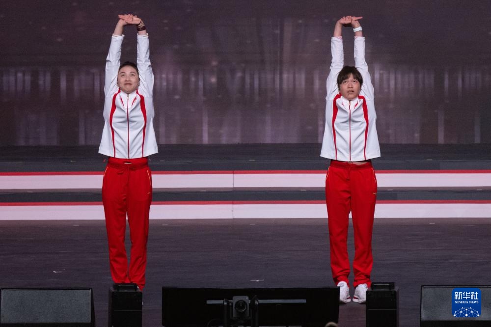 圖為乒乓球運動員和羽毛球運動員在游戲環節中。