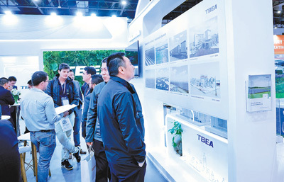 在中國(guó)企業(yè)特變電工公司展臺(tái),參觀者在了解該公司項(xiàng)目案例。 本報(bào)記者 陳海琪攝 |