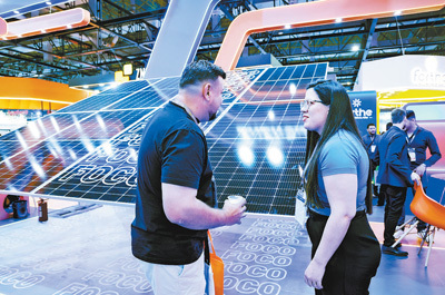 巴西光伏供應(yīng)商Foco能源公司工作人員向客戶介紹最新的光伏組件產(chǎn)品。 本報(bào)記者 陳海琪攝 |