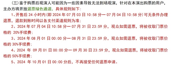 2023年9月,文化和旅游部與公安部聯合印發了《關于進一步加強大型營業性演出活動規范管理促進演出市場健康有序發展的通知》,要求“演出舉辦單位應當建立大型演出活動退票機制,設定合理的梯次退票收費標準,保障購票人的正當退票權利”。從現實情況看,該規定使演出門票“一經售出,概不退換”現象大大減少,但對于“梯次退票收費標準”語焉不詳,缺乏具體指導性。