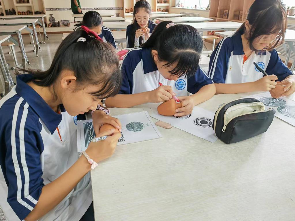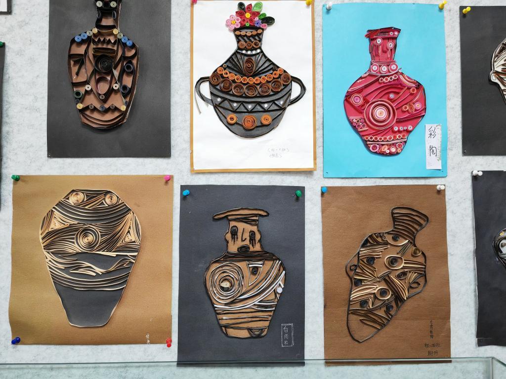 通過多年的摸索,學校的彩陶課程已形成教學體系,分為繪制平面衍生紋樣、衍紙材料制作彩陶紋飾、超輕黏土還原彩陶、卡紙繪制立體鏤空紙藝彩陶,以及設計制作古風書簽和扇面等學習板塊。