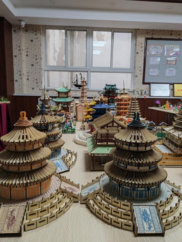 在工作坊的展覽桌上,擺放著一棟棟木棍搭建和紙卷搭建的歷史建筑模型。現在李毅正在嘗試將陶藝課的知識和歷史、語文、生物等主課進行融合。“比如高一年級上《中國建筑的特征》課,我主動和語文老師合作,一起帶領同學們制作一些古建筑模型,讓學生在制作過程中,掌握更多的知識,了解歷史文化背景,認識樓體的每一個結構、每一個紋飾圖案,使陶藝課發揮更大作用。”