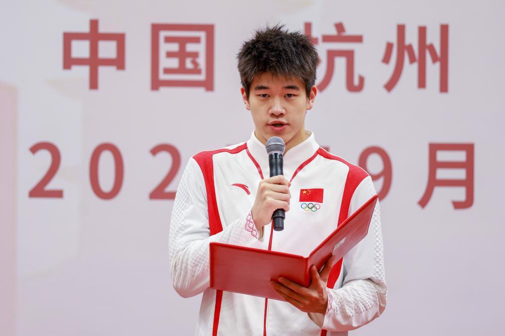 9月3日,游泳運動員潘展樂在活動中領讀“體育力量 青春榜樣”倡議書。新華社記者 江漢 攝