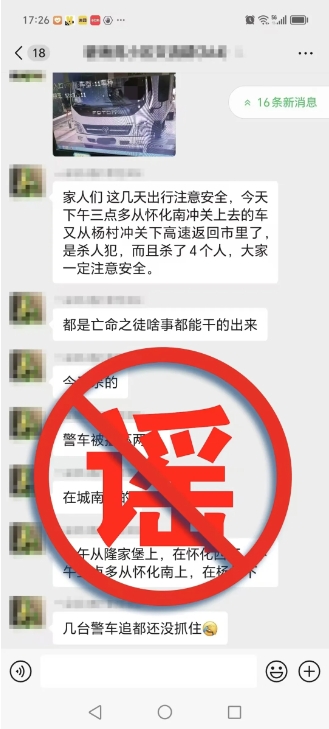 近日,鶴城區網民易某云在某小區微信群發布“懷化亡命之徒沖關殺4人”的內容,引發網民關注。經核實,鶴城區未發生此類案件,該消息為謠言。