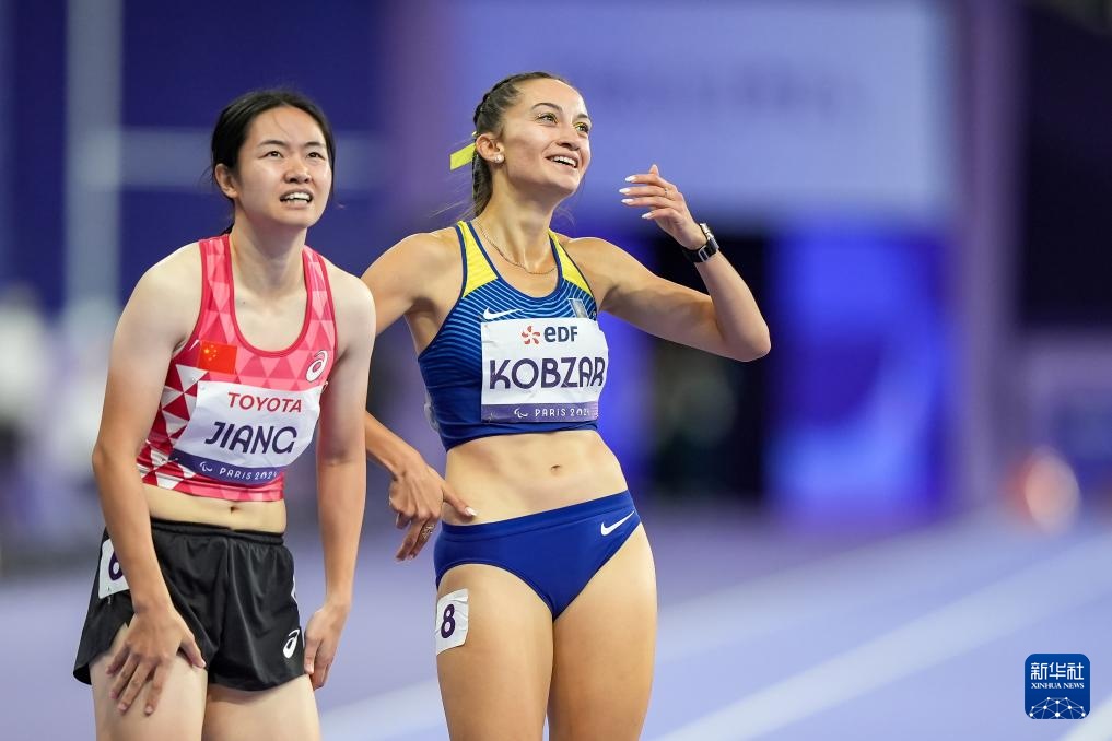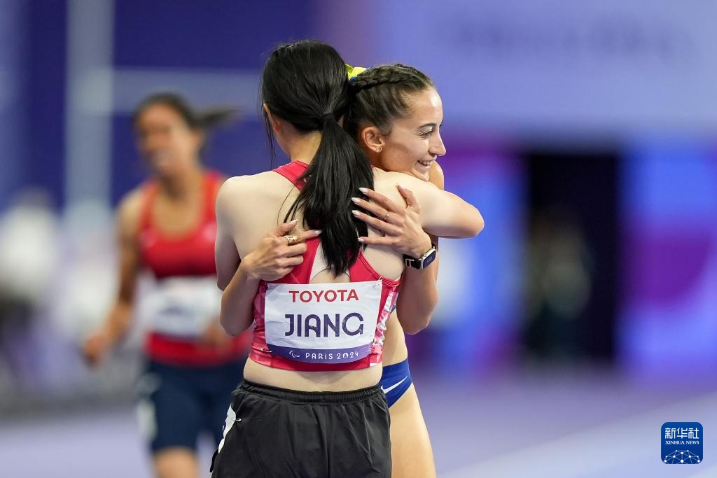 9月3日,中國選手蔣芬芬(左)在沖線后擁抱烏克蘭選手科布扎里。