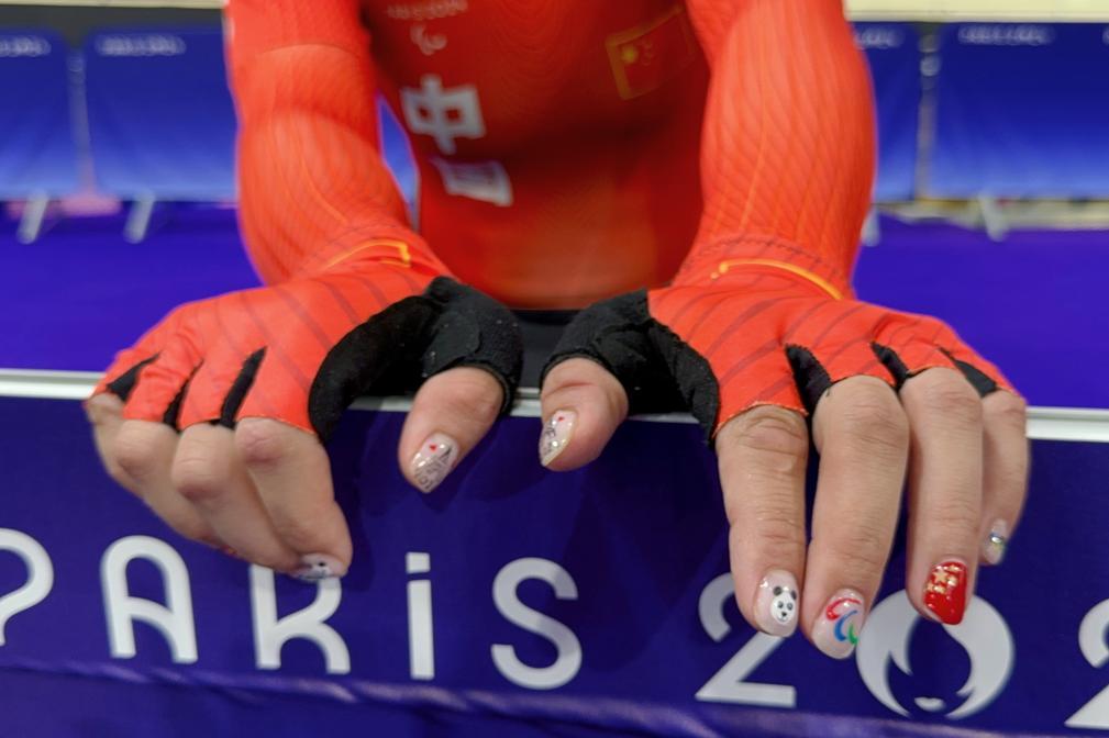 王小梅的隊友錢王偉兩次打破世界紀錄,在女子C1-3級500米個人計時賽中摘銀。來到巴黎后,她在殘奧村做了自己喜歡的美甲。“翻譯幫我和美甲師溝通的,這上面有我們中國的國旗、國寶熊貓、奧運的標志和當地的標志性建筑(埃菲爾鐵塔)。”