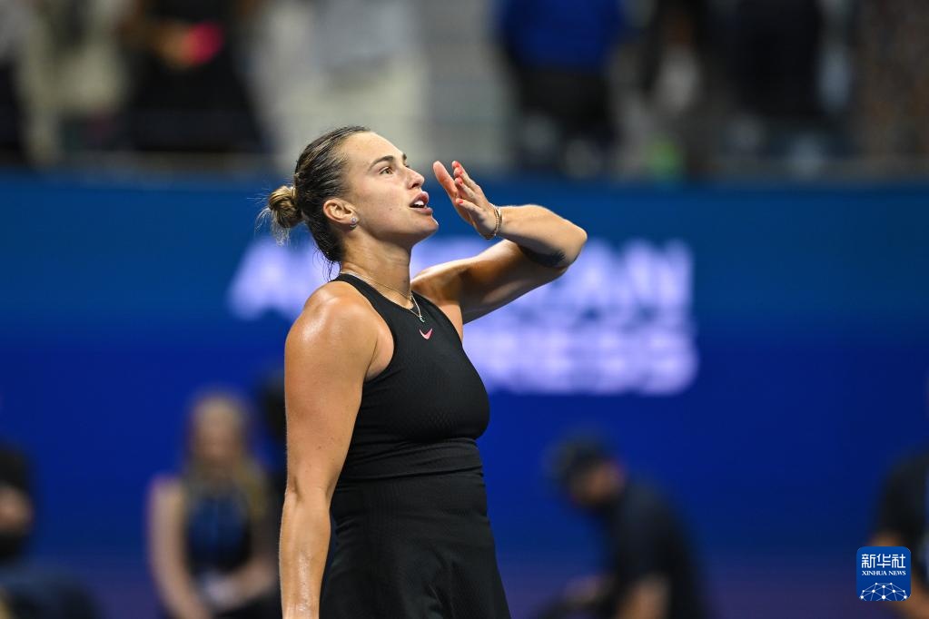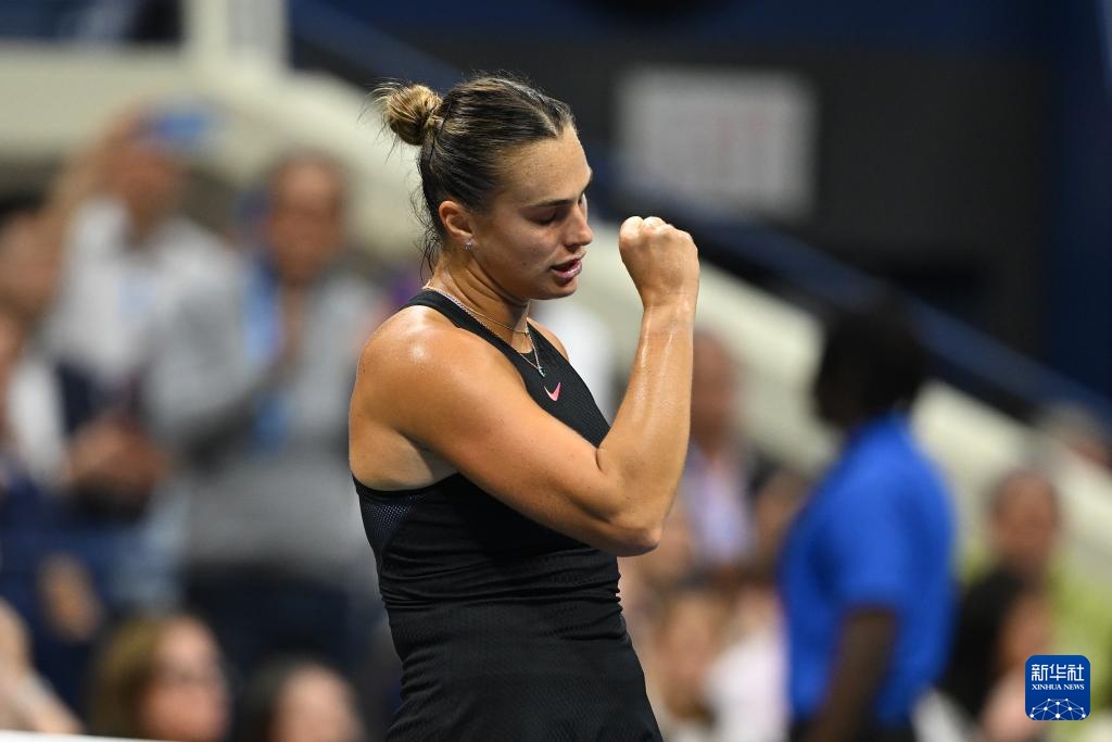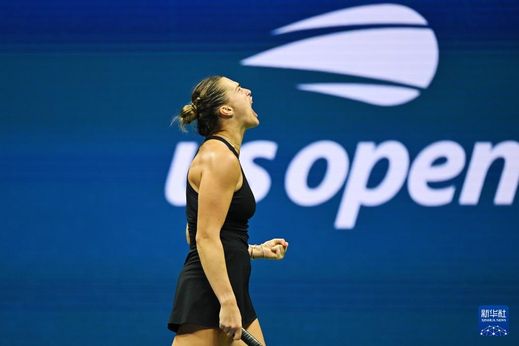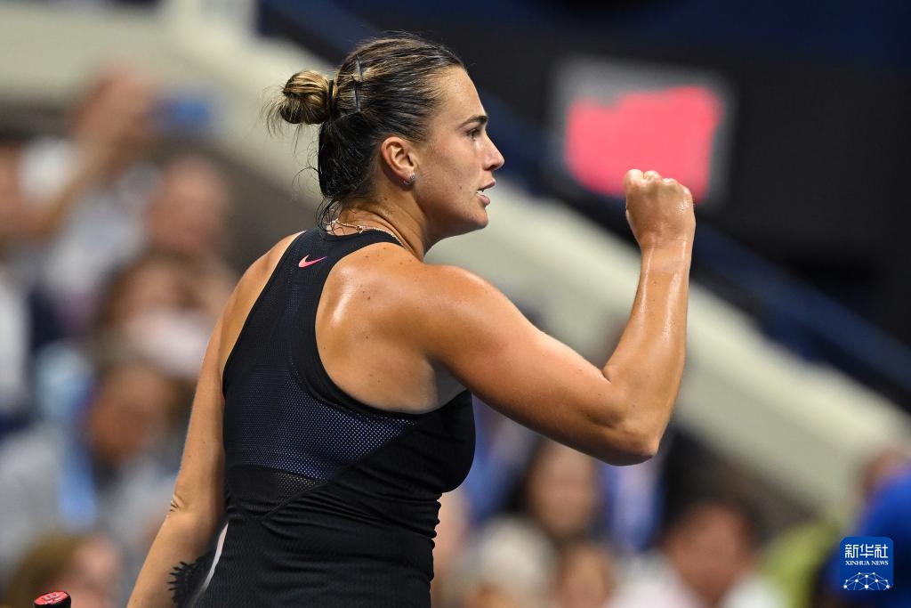 9月5日,薩巴倫卡在比賽中慶祝得分。新華社記者 李睿 攝