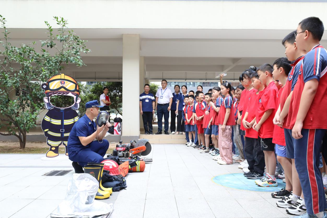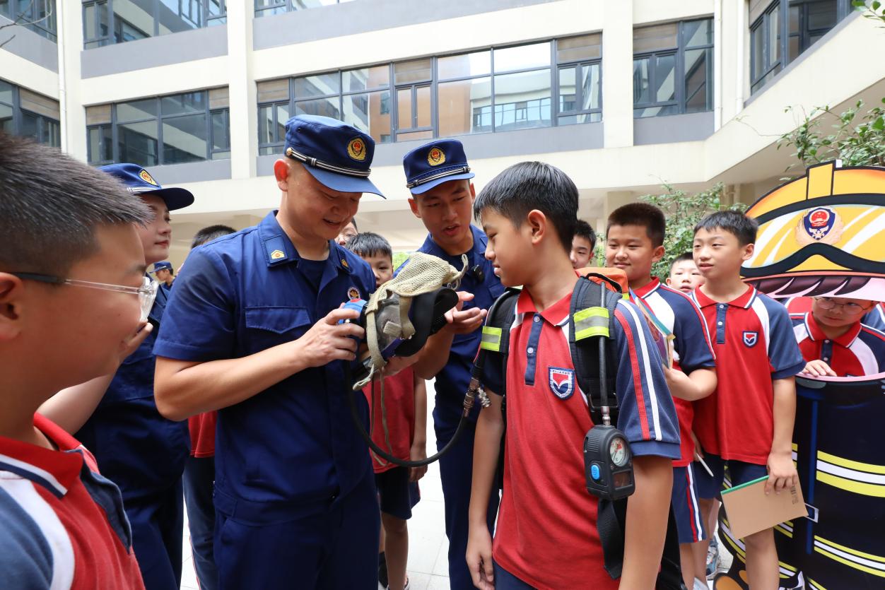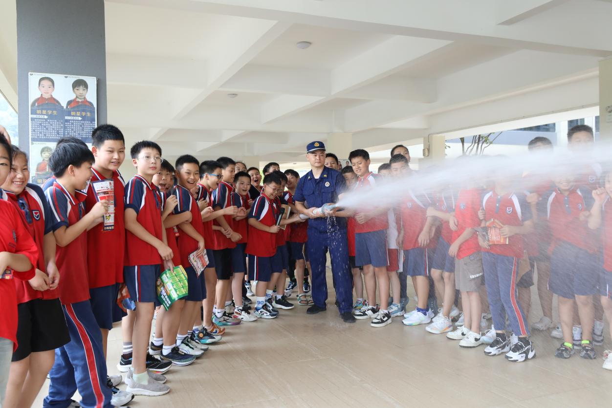 在互動體驗環節,消防卡通立牌吸引了大批師生合影打卡,消防救援人員現場發放宣傳冊,組織師生開展油盆滅火、消防栓出水實操應急演練,同學們在消防員的指導下用滅火器撲救初期火災,消防救援人員結合自身多年來的滅火救援經驗,向大家講解家庭防火“三清三關”,緊急情況下逃生自救方法等消防安全知識,展示救援服裝和消防救援設備,用通俗易懂的語言講解服裝設備的功能作用,并邀請學生試穿消防服裝,過了一把“消防癮”。