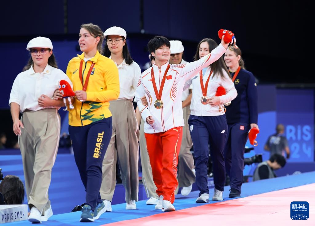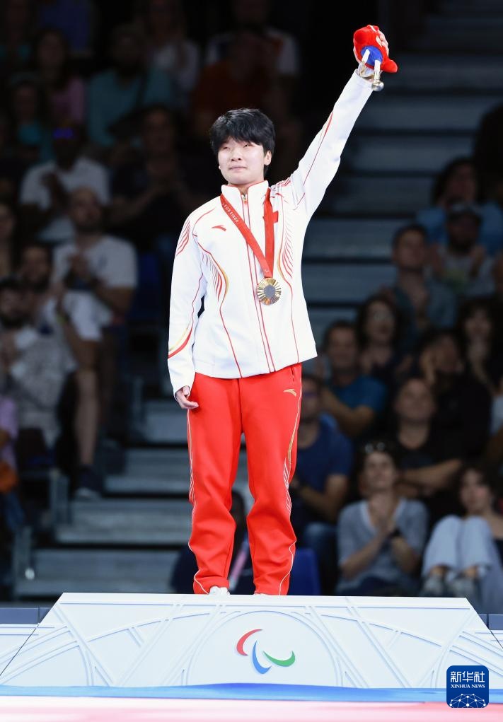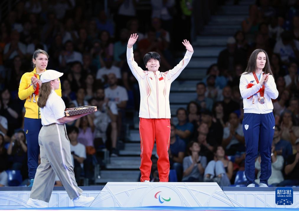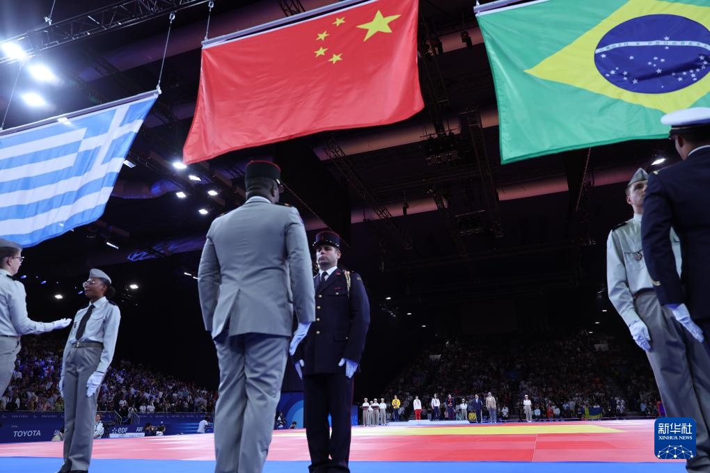這是9月6日拍攝的巴黎殘奧會(huì)盲人柔道女子70公斤J1級(jí)頒獎(jiǎng)升旗儀式現(xiàn)場(chǎng)。