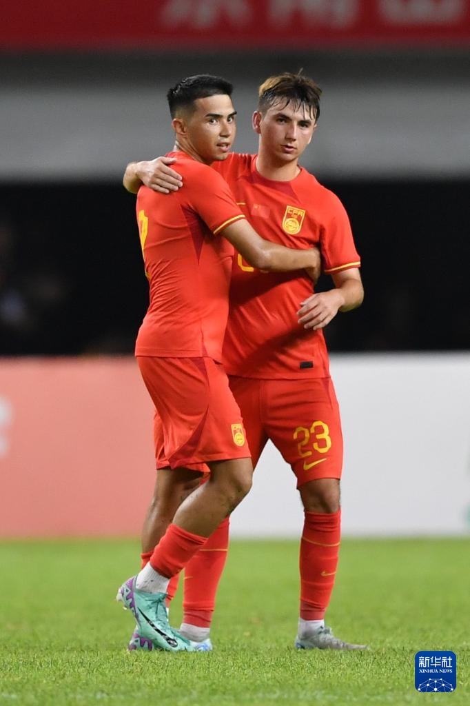 9月7日,中國隊球員艾菲爾丁·艾斯卡爾(左)在進球后和隊友阿布都合力力·吾斯曼江慶祝。