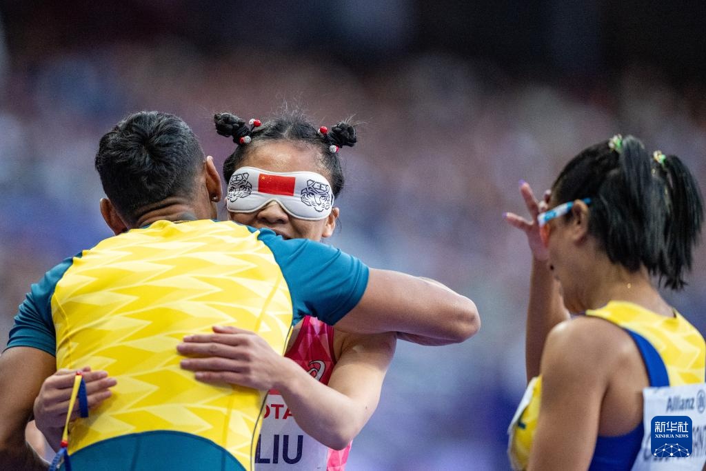 9月7日,中國選手劉翠青(中)在比賽結束后與巴西選手杰魯薩·格貝爾·多斯·桑托斯(右)的領跑員桑托斯·加西亞擁抱致意。