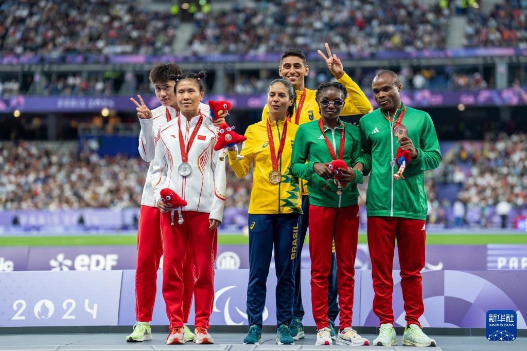 9月7日, 冠軍巴西選手杰魯薩·格貝爾·多斯·桑托斯(左三)和領跑員桑托斯·加西亞(右三)、亞軍中國選手劉翠青(左二)和領跑員陳圣明(左一)、季軍納米比亞選手拉哈賈·伊希蒂利(右二)和領跑員塞姆(右一)在頒獎儀式上。