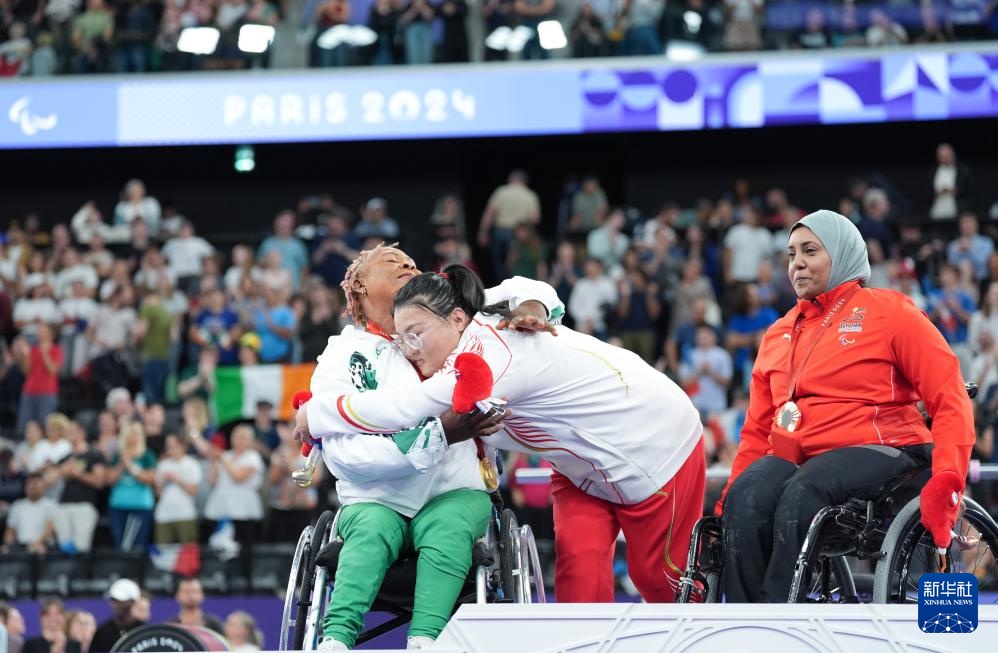 9月7日,冠軍中國選手韓淼雨(中)在頒獎儀式上擁抱亞軍尼日利亞選手博斯(左)。