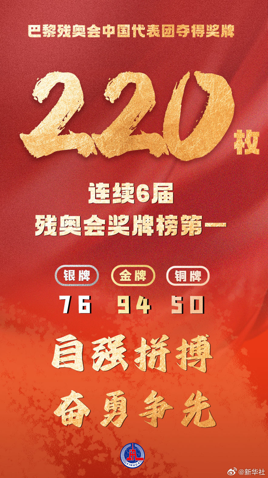 【傳遞祝賀!中國殘奧軍團94金76銀50銅收官】巴黎殘奧會中國體育代表團,94金、76銀、50銅!中國連續6屆殘奧會金牌獎牌第一!致敬不屈的靈魂!轉發,為夢想點贊!