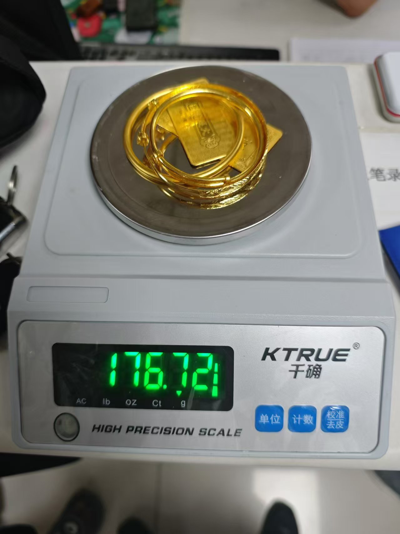 民警試著拔打騙子電話,發(fā)現(xiàn)可以打通,證明騙子還沒意識到受害人已報警。民警將計就計,立即開展行動,讓劉某繼續(xù)與詐騙分子聯(lián)系,答應(yīng)購買15萬元的黃金,隨即在紙坊一金店的“配合”下,民警將購買黃金的單據(jù)、網(wǎng)約車牌由劉某某轉(zhuǎn)發(fā)給詐騙分子。在獲取接收地址后,派出所立即組織警力隨同網(wǎng)約車趕往蔡甸區(qū)姚灣村布控。17日20時許,民警在蔡甸區(qū)通城大道姚灣村村口附近,發(fā)現(xiàn)一戴著帽子、口罩的男子蹲在路邊玩手機,民警繼續(xù)前行偵查有無同伙,約行駛50多米,發(fā)現(xiàn)一輛車停在路口中間,行跡十分可疑。民警掉轉(zhuǎn)車頭將嫌疑人孫某控制,并在孫某攜帶的黑色皮包中查獲黃金176克,將孫某押上警車后,驅(qū)車抵住嫌疑車輛尾部防止逃竄,然后拉開車門,將車上的男子鄒某控制,在鄒某車內(nèi)查獲用于稱量黃金的電子秤一個、現(xiàn)金4000余元、黃金首飾盒及包裝袋熔煉工具若干。