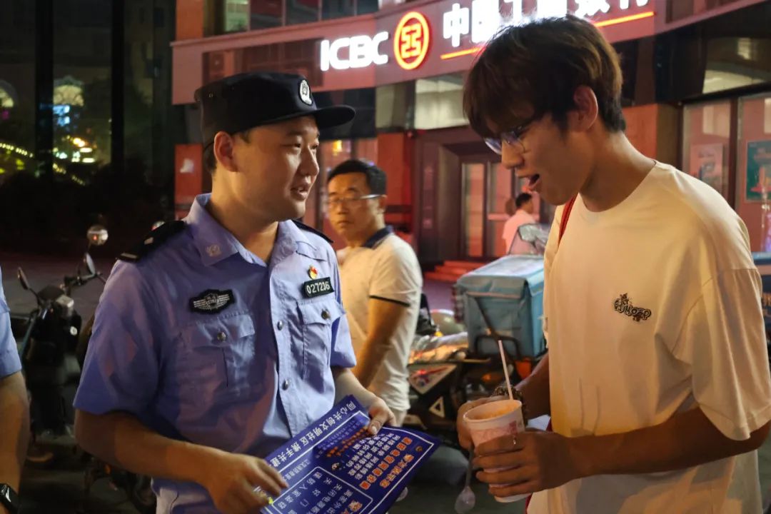 9月7日晚19時許,花樓派出所張大洋政法先鋒隊的隊員們對江漢路步行街進行巡邏,并對轄區歌舞娛樂、洗浴按摩、棋牌影院、桌游密室、旅館住宿等重點部位,進行治安巡查。晚8點,江漢路街頭人聲鼎沸、熱鬧非凡,張大洋政法先鋒隊忙碌在江漢路地標性打卡點happy站臺前,向來來往往的路人發放反詐宣傳單,“不輕信,不轉賬,不理會,不參與……”“請您看下我們的反詐單,一定守護好自己的錢袋子!”,路過的男女老少不時被警官們生動的反詐宣講吸引,認真駐足聆聽并頻頻點頭,忙碌穿梭的藏藍身影成為流光夜幕中一道獨特的風景線。