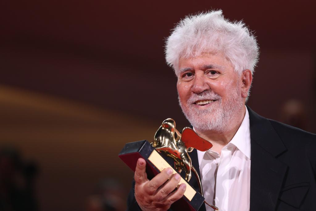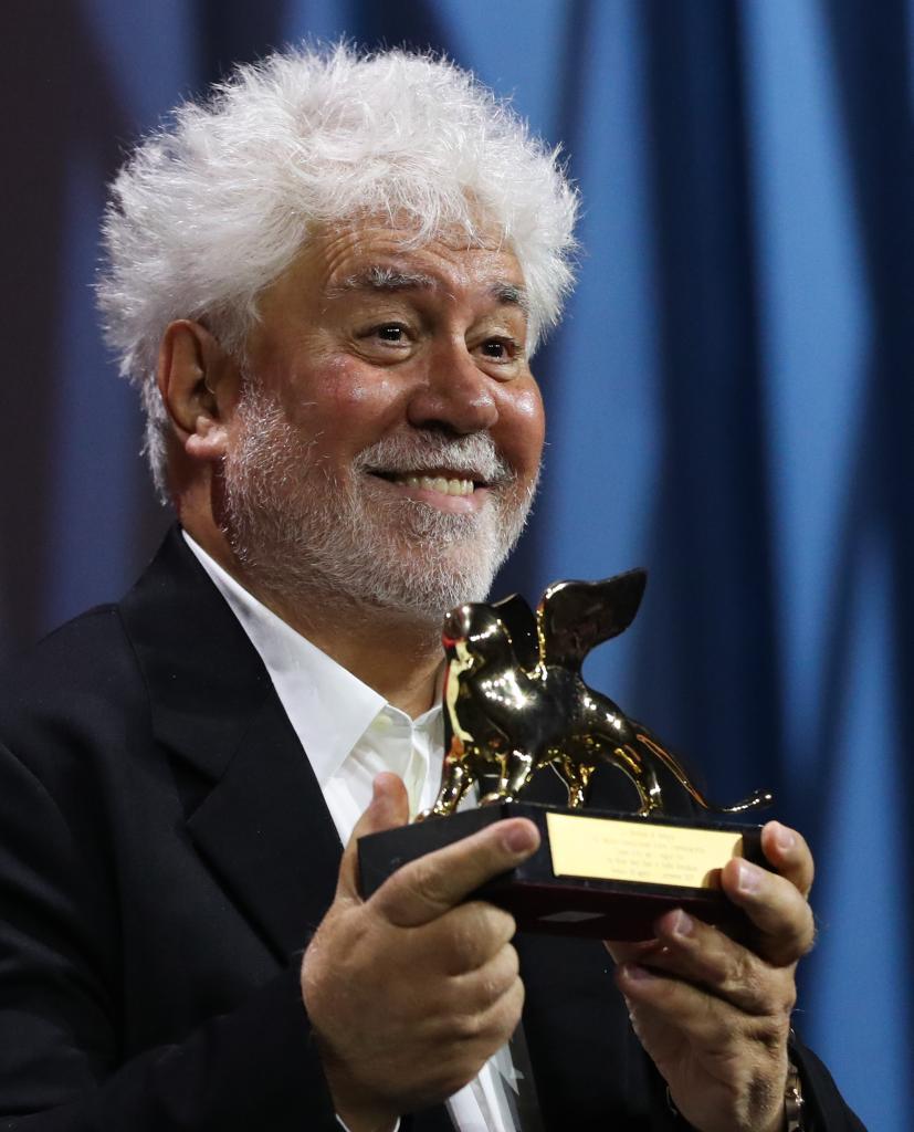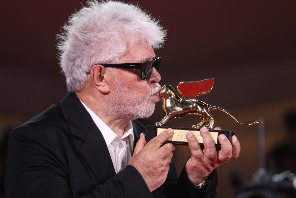 9月7日,在意大利威尼斯,憑借影片《隔壁房間》獲得最佳影片金獅獎的西班牙導演佩德羅·阿莫多瓦與金獅獎杯合影。新華社記者 李京 攝
