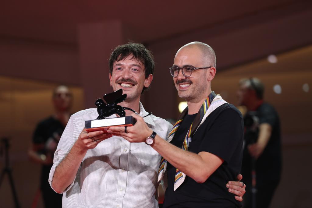 9月7日,在意大利威尼斯,憑借影片《我仍在此》獲得最佳編劇獎的穆里洛·奧塞爾(右)和埃托爾·洛雷加與獎杯合影。新華社記者 李京 攝