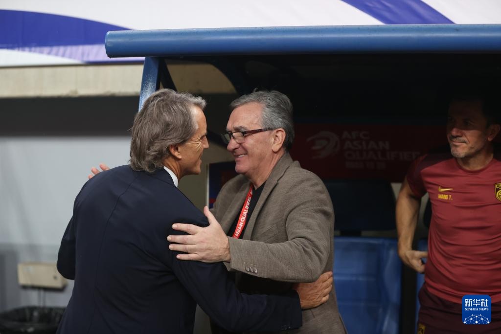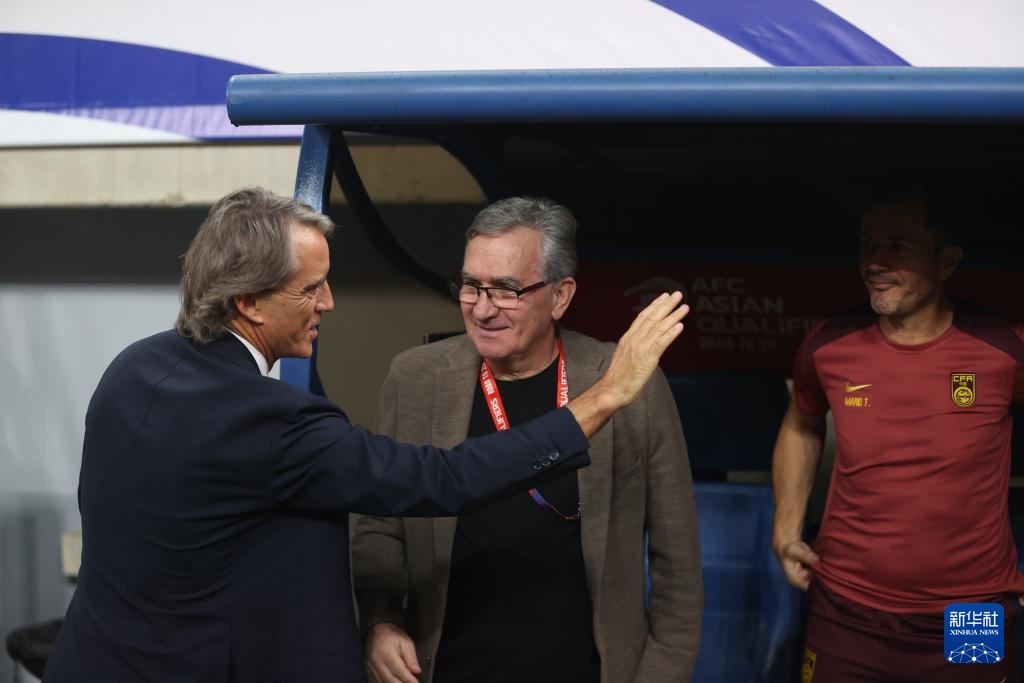 9月10日,中國隊主教練伊萬科維奇(中)和沙特隊主教練曼奇尼(左)在比賽前相互致意。