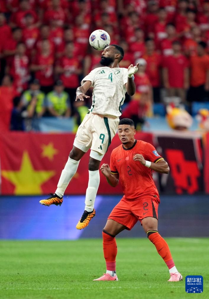 9月10日,沙特隊球員卡代什(左)與中國隊球員費南多拼搶。