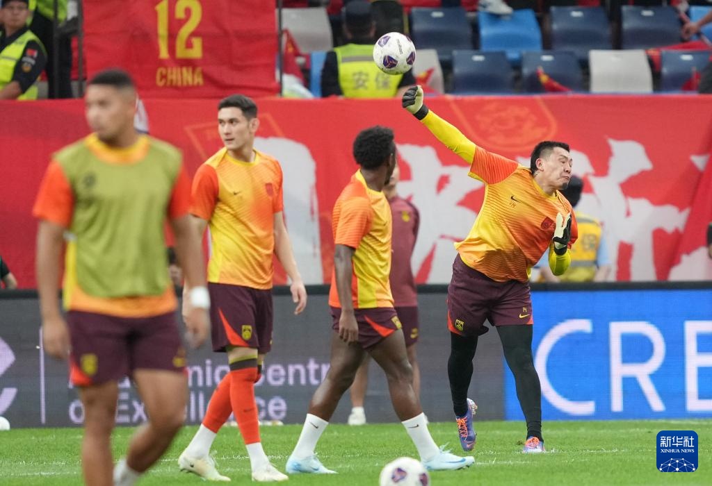 9月10日,中國隊守門員王大雷(右一)在比賽前熱身。