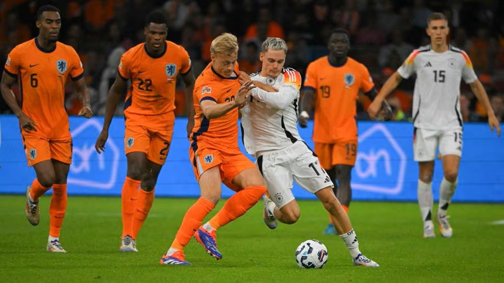 荷蘭隊和德國隊在比賽中。圖片來自歐國聯官網