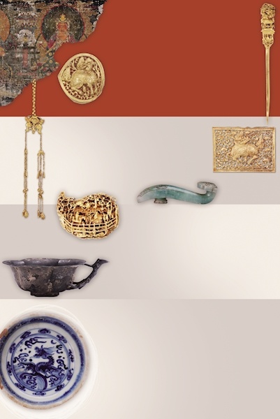 本次展覽中展示的報恩寺精美壁畫 明代桃形 麒麟金帶飾 明代鏤空人物樓閣金發簪 明代金鴛鴦胸佩 明代長方麒麟金帶飾 明代如意形帶鉤 明代葉形人物 花卉金鈿 梅花銀杯 明代青花龍紋瓷盤