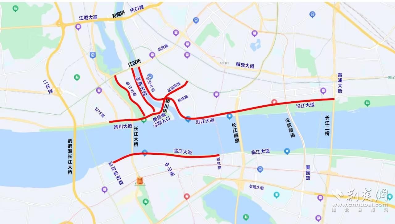 1、當(dāng)天19:00—22:00,晴川橋?qū)⒔箼C(jī)動(dòng)車(chē)、非機(jī)動(dòng)車(chē)、行人通行;沿河大道武勝路口至民族路口、沿江大道民族路口至黃浦大街路口,友誼南路、晴川大道攔江路口至南岸嘴公園入口,知音大道東月湖路口至高公街路口,龜山北路,臨江大道彭劉楊西路口至新生路口禁止機(jī)動(dòng)車(chē)通行和停放;以上道路相鄰路段及路口,視情實(shí)施臨時(shí)交通限制措施。