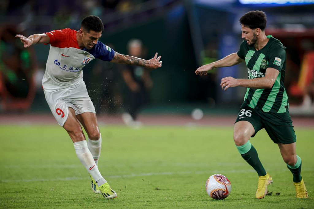 9月13日,上海申花隊球員安德烈·路易斯(左)在比賽中射門得分。新華社記者 江漢 攝